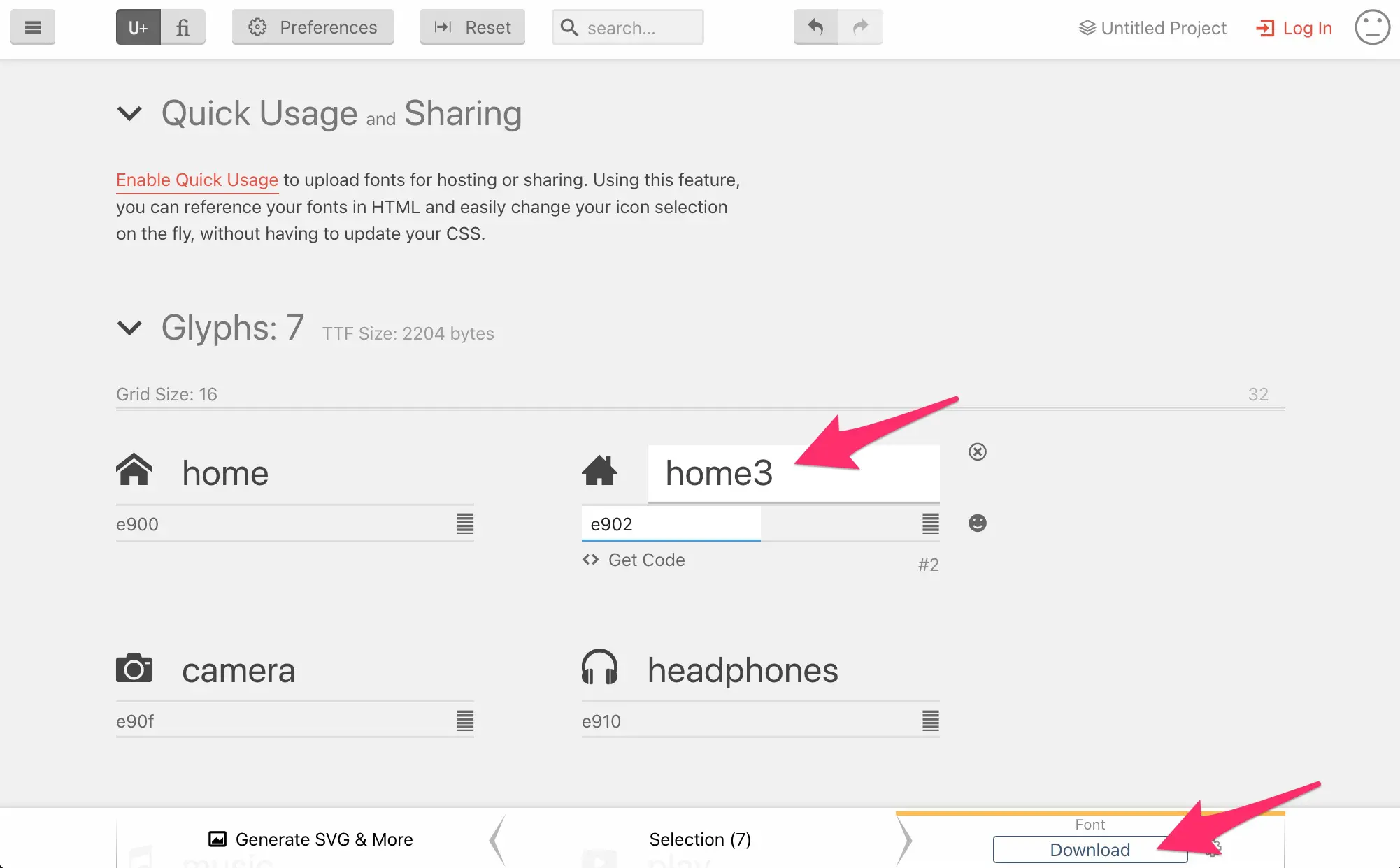 下載 Icon Font 之前,可以在畫面中設定該圖示的名稱與 unicode 編碼 ( 建議 unicode 按照預設編碼 ),完成後點擊右下角「Download」按鈕就能下載一個 Icon Font 的 zip 壓縮檔。